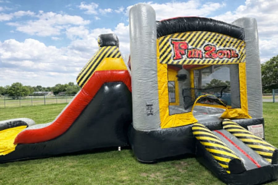 Bring big energy to your next party with the Fun Zone Combo — a bold, action-packed bounce house with slide rental available from our Bounce Around Springfield location! With its eye-catching black-and-yellow “caution” theme, roomy bounce area, and attached slide, this inflatable is perfect for kids who love nonstop movement. Guests can jump, play, and race through the entrance and slide area again and again, making it a fantastic centerpiece for birthdays, school events, church gatherings, fall festivals, and community celebrations.