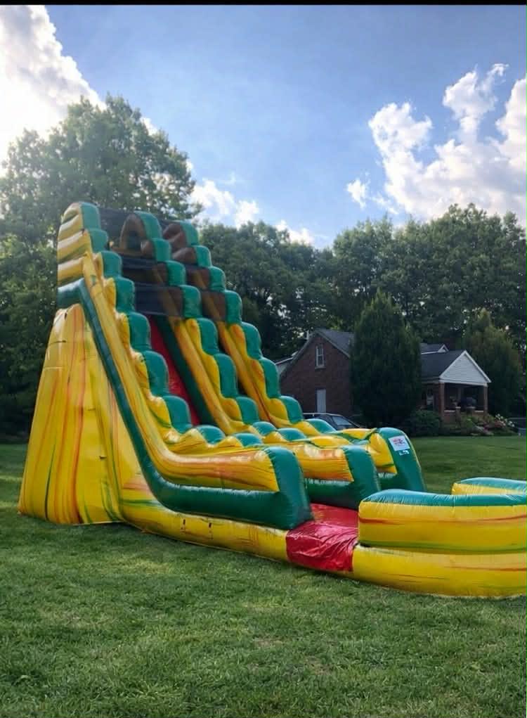 This towering inflatable brings big thrills and tropical vibes to any party! Riders climb to the top of the 19-foot tall slide before racing down the fast lane and splashing into the refreshing pool below. Its bright green and yellow colors give it a fun fiesta-style look that instantly grabs attention and becomes the highlight of any backyard celebration. Perfect for hot summer days, birthday parties, school events, and family gatherings, this slide keeps kids entertained and laughing for hours.