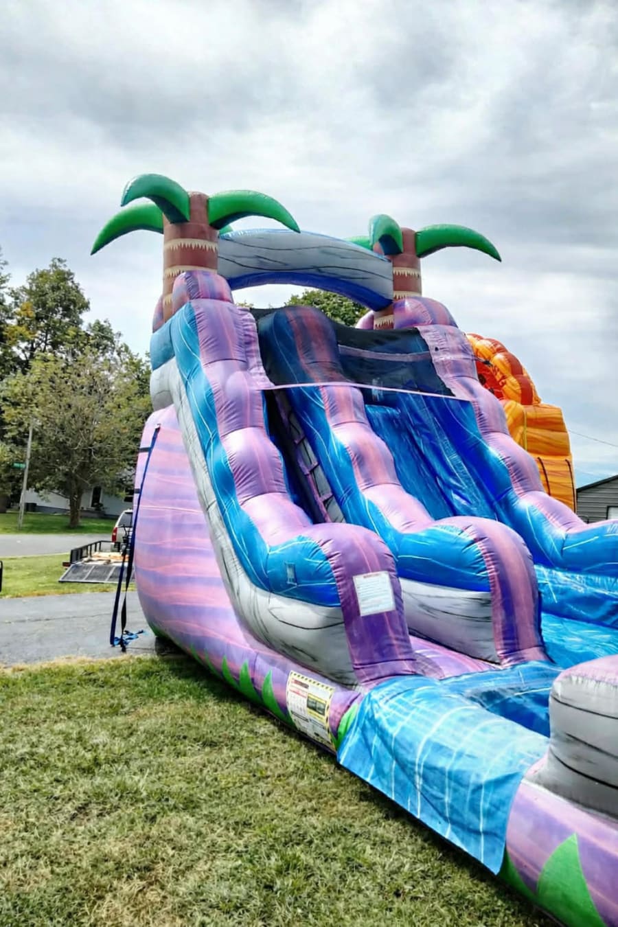 With its eye catching purple and blue tropical colors and towering palm trees at the top, this slide instantly turns any party into a fun island adventure. Riders climb to the top of the 16 foot slide, race down the slippery lane, and splash into the refreshing pool below for the ultimate summer thrill! Perfect for birthday parties, backyard celebrations, school events, church gatherings, and hot summer days, the Purple Crush delivers nonstop excitement and keeps everyone cool while the fun keeps flowing.